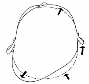 - Un mecanismo frecuente es de carácter mixto: niños que ya nacen con asimetría craneal producida dentro del útero o durante el parto y que durante las primeras semanas de vida empeoran por asociarse cualquiera de los factores previamente citados. Debido a la anomalía previa, la cabeza siempre tiende a apoyarse sobre el lado previamente aplanado, agravándose la situación todavía más cuando existe tortícolis.